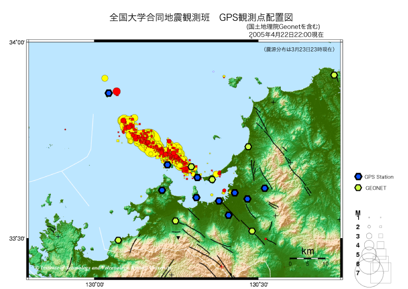 2005年(平成17年)3月20日10時53分の本震(Mjma7.0)発生以降の、玄界灘及びその周辺地域での地震活動マップです。このマップは、毎日4時過ぎに更新されます。