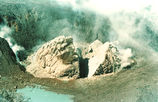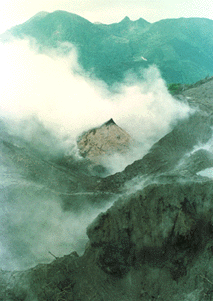 (左)1991年5月20日、地獄跡火口に出現した溶岩ドーム。毎日新聞社提供。
