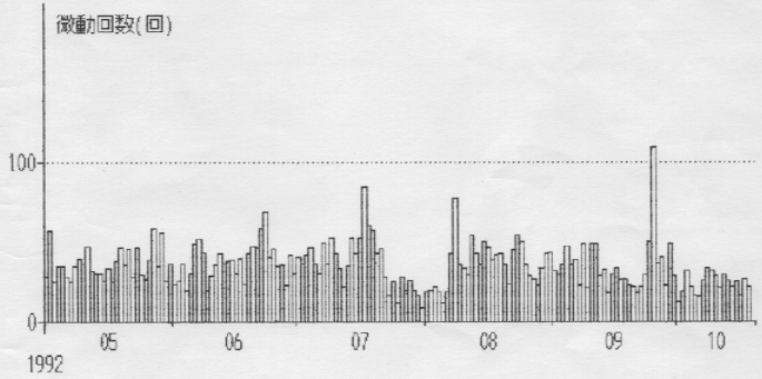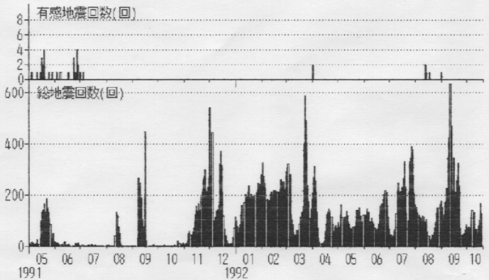 雲仙岳測候所で観測した火山性地震は引き続き多く発生しました。この期間の地震・微動・火砕流と思われる震動波形の推移は第4図,第5図及び第2表のとおりです。(値は速報値で,後日修正される事があります)。