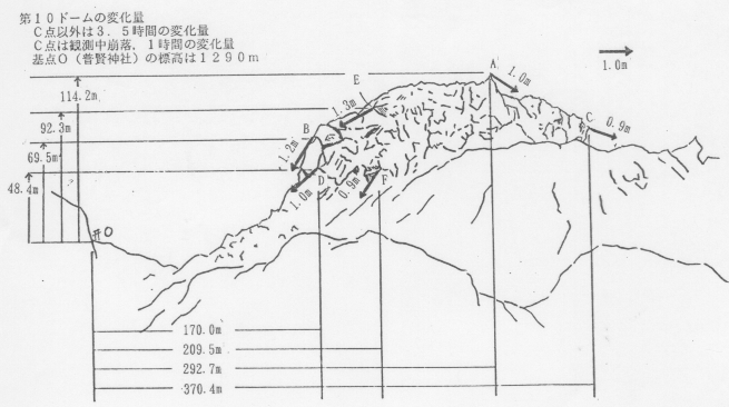 第10ドームは灰色で放射状に花びらを形成しており,北側は第5ドームの上に乗り出し,オーバーハングになっていました。また,北東及び東側には,前回の観測より成長しており,北東側は,一部第5ドームを乗り越えて10ドーム自身が崩落していました。その他のドームに変化はみられませんでした。また,火砕流堆積物の状況はドーム北側のテラス(鳩穴付近)では,前回の現地観測の時と比べ堆積物の量が増えていました。龍の馬場付近は,前回の現地観測の時と変化なく,龍の馬場の縁まで100メートル付近のところまで達していました。おしが谷方向へは,比較的新しい堆積物が,火口からの水平距離で約2キロメートル付近まで達しており,その流路はおしが谷中央部に沿って流下しており,中尾川源流への流入はありませんでした。水無川方向へは比較的新しい堆積物が,火口からの水平距離で2.5キロメートル付近まで達していました。赤松谷方向へは火口からの水平距離で1.5キロメートル付近まで達していました。