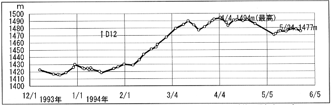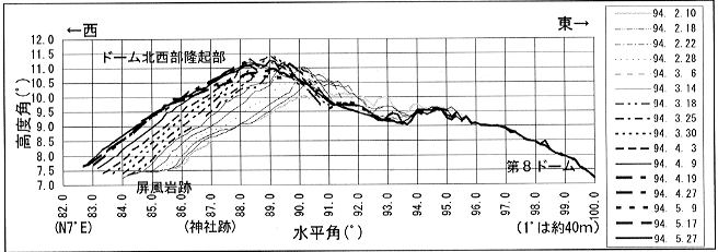 第13図 溶岩ドームの標高変化(1993/12/7-1994/5/27:仁田峠第2展望所より)
