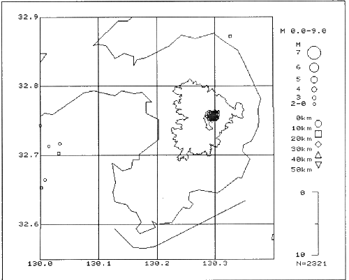 この期間の地震・微動・火砕流と思われる震動波形の発生状況の推移は第2表,及び第6図,第7図,第8図のとおりです。また,この期間の地震の震源の分布は第5図のとおりです。