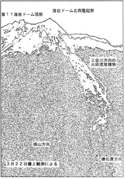 溶岩ドーム北西斜面に50メートルから100メートルの剥離した部分があり,この部分から三会川方向へ新しい堆積物が分布して,火口から0.5キロメートル付近まで達していました。