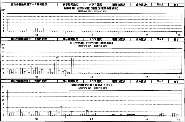 普賢岳山体を震源とする比較的浅い地震(B型地震)の発生回数は,月全体をとおして1日当たり数回から60回の間で消長を繰り返しながら推移しました。昨年末に引き続き,比較的振幅の大きな地震が含まれ,有感地震も4回観測しました(全て震度T)。これらの地震のなかで,最も大きなものは16日01時33分に震度Tを記録したマグニチュ−ド2.6の地震で,基準観測点(A点、矢岳)での上下動振幅は約42μmでした(第4図)。