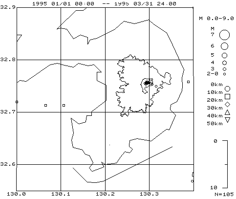 この期間の火山性地震・火山性微動・火砕流と思われる震動波形の発生状況の推移は第1表,及び第1図から第5図のとおりで,この期間の火山性地震の震源分布は第6図のとおりです。