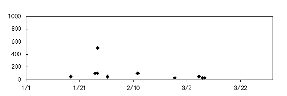 この期間(1,2,3月共に),雲仙岳測候所においては,降灰を観測しませんでした。平成2年(1990年)11月の噴火以来,月降灰量が「なし」となったのは平成3年(1991年)7月以来のことです。