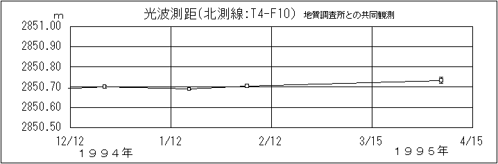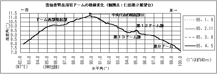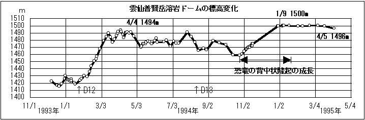 機上観測により昨年11月から観測されている溶岩ドーム西側隆起部の中央付近の恐竜の背中状隆起は,1月上旬までごくわずかずつ隆起を続け,仁田峠第2展望台観測定点からの稜線観測によると,標高は9日には1500メ−トルとこれまでで最高に達しましたが,1月末以降1499メ−トルでほぼ一定でした(なお,4月5日の観測によると1496メ−トルになっています)。また,新大野木場観測定点からの測量観測によると,2月中旬頃まで溶岩ド−ム西側隆起部の南側の峰がわずかに張り出しているのが観測されましたが,その後は変化はありませんでした。