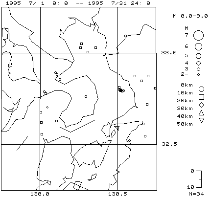 7月の火山性地震・火山性微動・火砕流と思われる震動波形の発生回数は第1表のとおりで,島原半島付近の震源分布は第1図のとおりです。