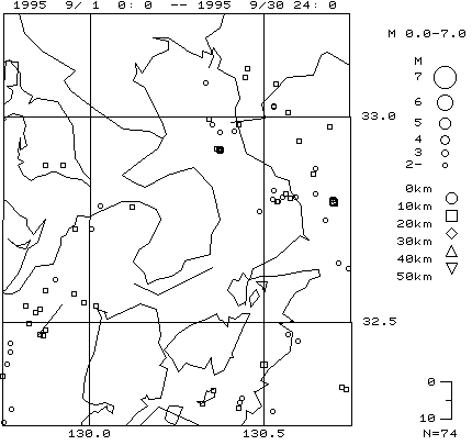 9月の火山性地震・火山性微動・火砕流と思われる震動波形の発生回数は第1表のとおりで,島原半島付近の震源分布は第1図のとおりです。