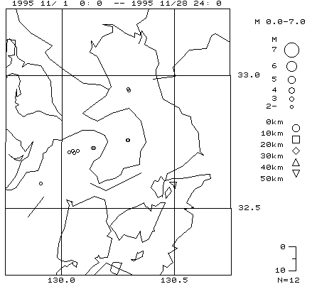 11月の火山性地震・火山性微動・火砕流と思われる震動波形の発生回数は第1表のとおりで,島原半島付近の震源分布は第1図のとおりです。