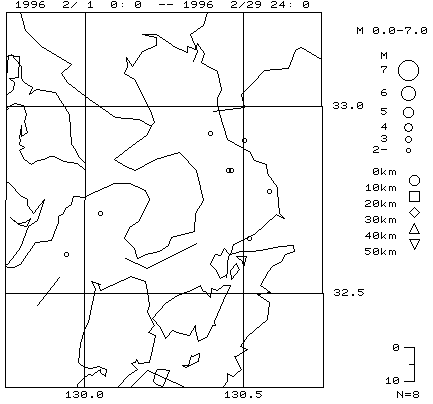 2月の火山性地震・火山性微動・火砕流と思われる震動波形の発生回数は第1表のとおりで,島原半島付近の火山性地震の震源分布は第1図のとおりです。