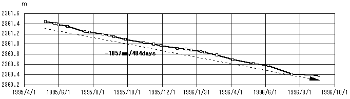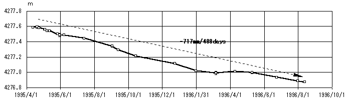 第3図 平成新山までの斜距離変化(1995/5/1-96/9/3:T6(仁田峠第2展望所)-D2)