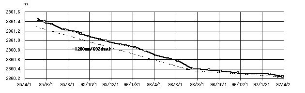 一方,九州大学との共同観測による,平成新山西側隆起部南東側に設置している反射鏡(D2)と仁田峠第2展望所観測定点(T6)の斜距離変化は第1図のとおりで692日間に1200mm縮んでいます。これは溶岩ドームが収縮・自重沈下していることによるものです。