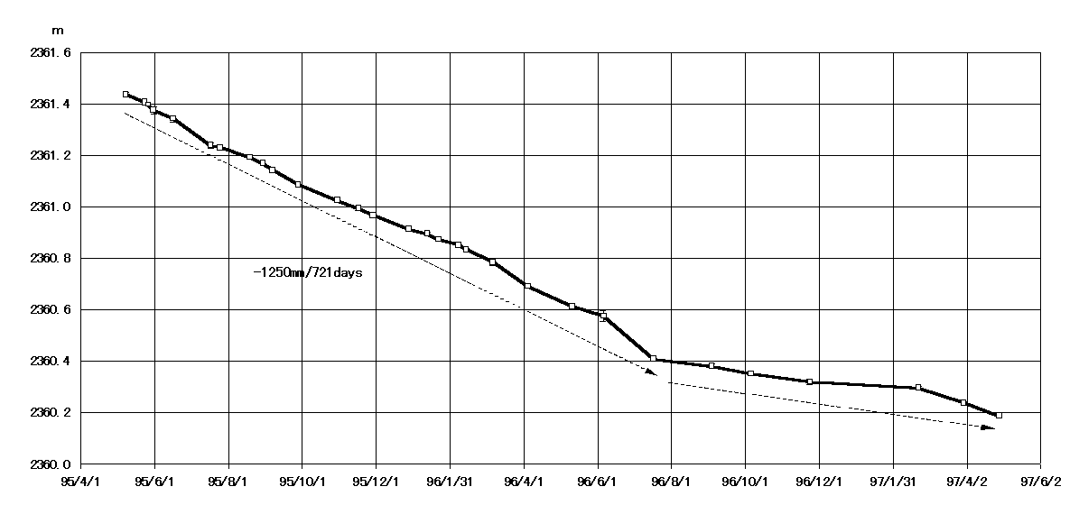 一方,九州大学との共同観測による,平成新山西側隆起部南東側に設置している反射鏡(D2)と仁田峠第2展望所観測定点(T6)の斜距離変化は第1図のとおりで721日間に1250mm縮んでいます。これは溶岩ドームが収縮・自重沈下していることによるものです。