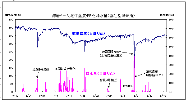 8月は19日に溶岩ドーム(平成新山)の現地観測を実施しました。前回(5月28日),地中温度が最も高かった観測点(412℃)は岩塊の崩落により埋没しており,測定できませんでした。それ以外で地中温度が最も高いところでは351℃を観測しました(埋没した観測点のすぐ西側)。50cm深の地中温度の観測結果は第1図のとおりです。