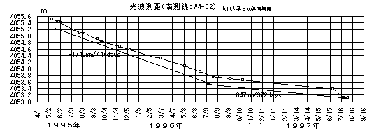 気象庁と通産省工業技術院地質調査所で行っている光波測量によると,普賢岳山体に付けた反射鏡との斜距離は北側及び南側の測線ともに,ほとんど変化はありませんでした。