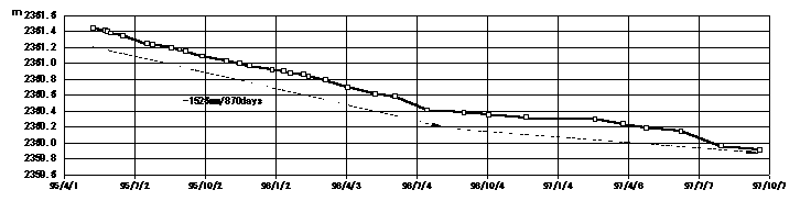 一方,九州大学との共同観測による,平成新山西側隆起部南東側に設置している反射鏡(D2)と仁田峠第2展望台観測定点(T6)の斜距離変化は第1図のとおり870日間に1.526m縮んでいます。これは溶岩ドームが収縮・自重沈下していることによるものです。