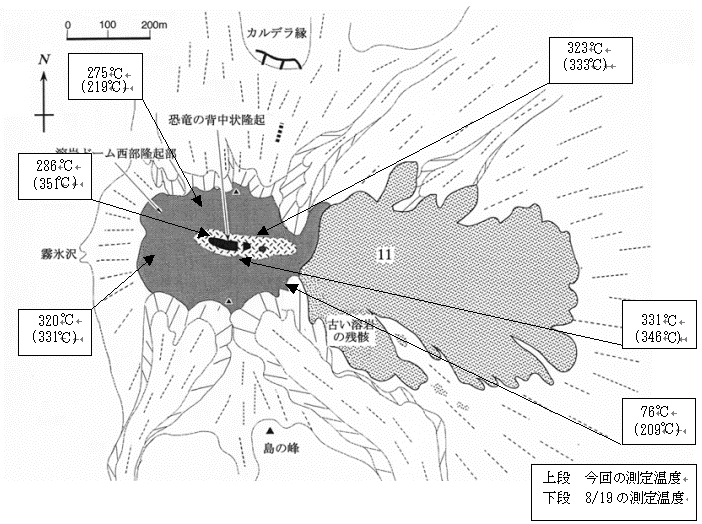 10月8日に溶岩ドーム(平成新山)の現地観測を実施しました。地中温度の最も高い場所は331度でした。またドームの形状,噴煙等には大きな変化はありませんでした。