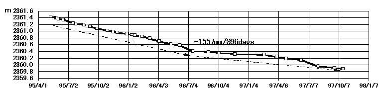 一方,九州大学との共同観測による,平成新山西側隆起部南東側に設置している反射鏡(D2)と仁田峠第2展望台観測定点(T6)の斜距離変化は第2図のとおり896日間に1.557m縮んでいます。これは溶岩ドームが収縮・自重沈下していることによるものです。