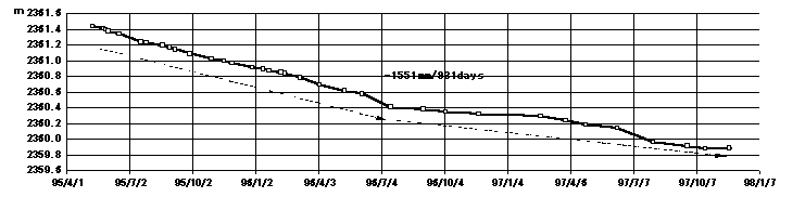 一方,九州大学との共同観測による,平成新山西側隆起部南東側に設置している反射鏡(D2)と仁田峠第2展望台観測定点(T6)の斜距離変化は図1のとおり931日間に1.551m縮んでいます。これは溶岩ドームが収縮・自重沈下していることによるものです。