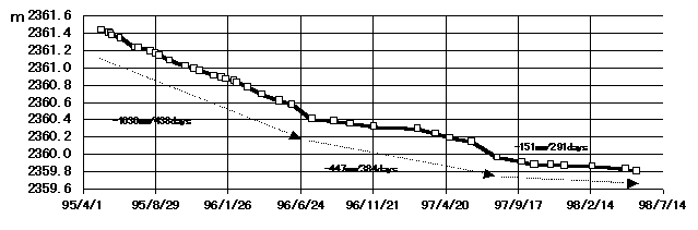 第1図 平成新山までの斜距離変化(1995/5/8-98/5/21:T6(仁田峠第2展望所)-D2)