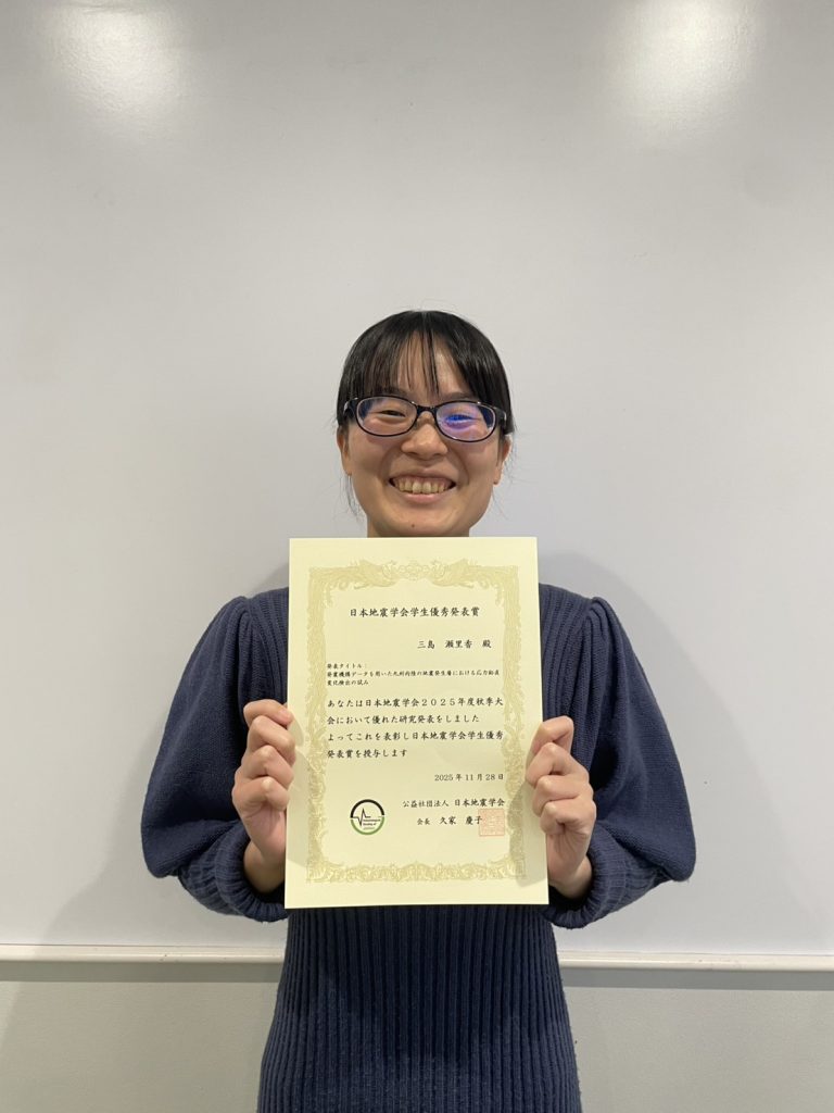 三島瀬里香さん(修士課程1年)が日本地震学会2025年度秋季大会において、学生優秀発表賞を受賞しました。この賞は、学生による優れた研究発表を奨励し、研究発表技術の向上を目指すために設けられた賞です。