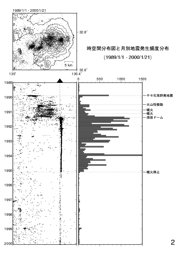 2. 島原半島周辺の地震の時空間分布と月別発生頻度分布