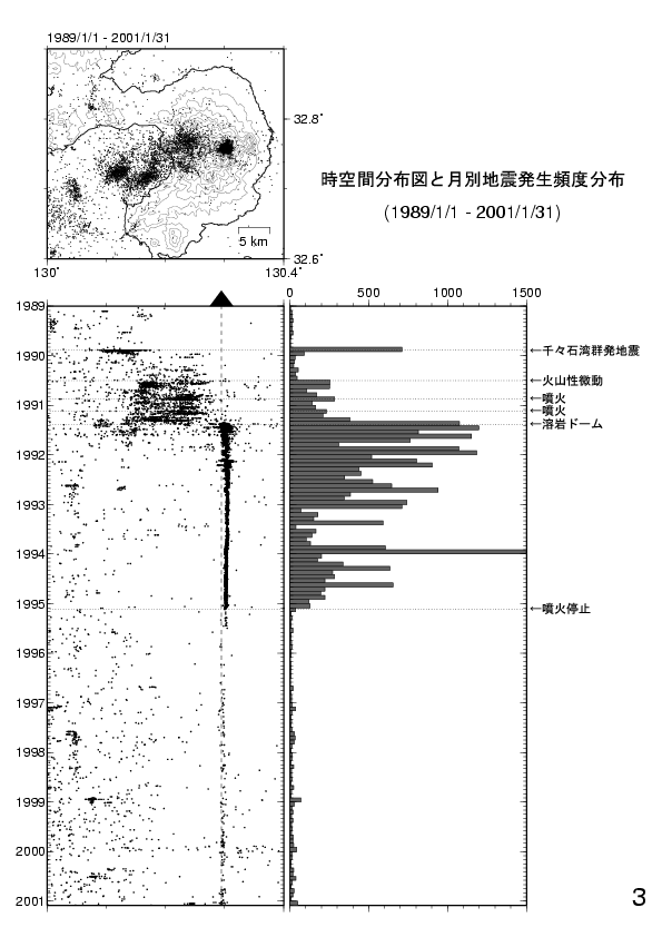 2. 島原半島周辺の地震の時空間分布と月別発生頻度分布