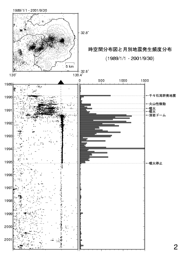 2. 島原半島周辺の地震の時空間分布と月別発生頻度分布