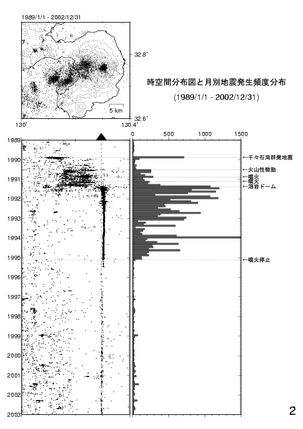 2. 島原半島周辺の地震の時空間分布と月別発生頻度分布