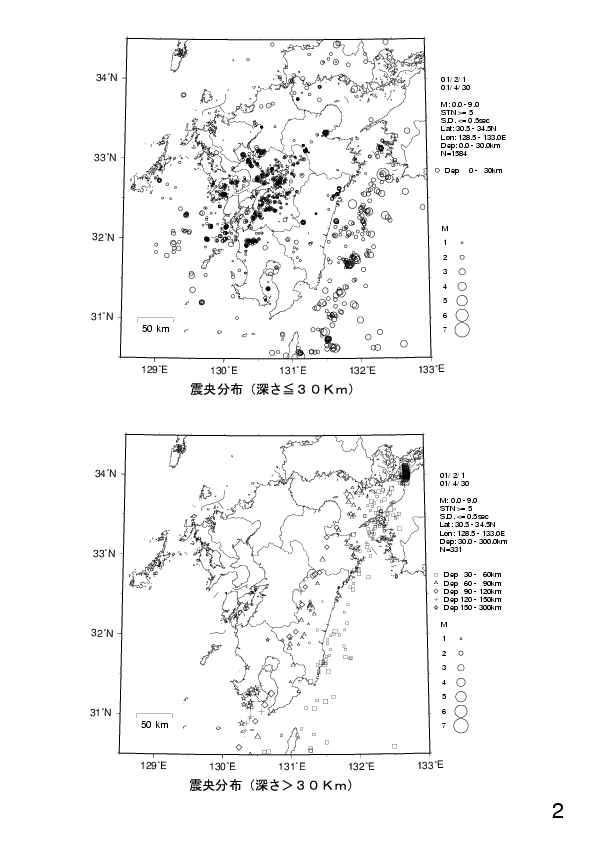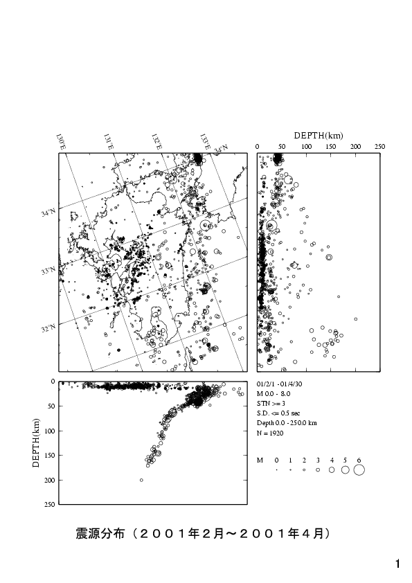 1. 九州の震源分布(2001年2月〜2001年4月)