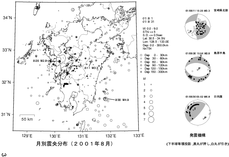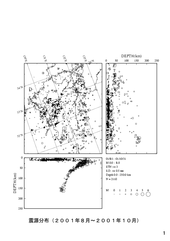 1. 九州の震源分布(2001年8月〜2001年10月)