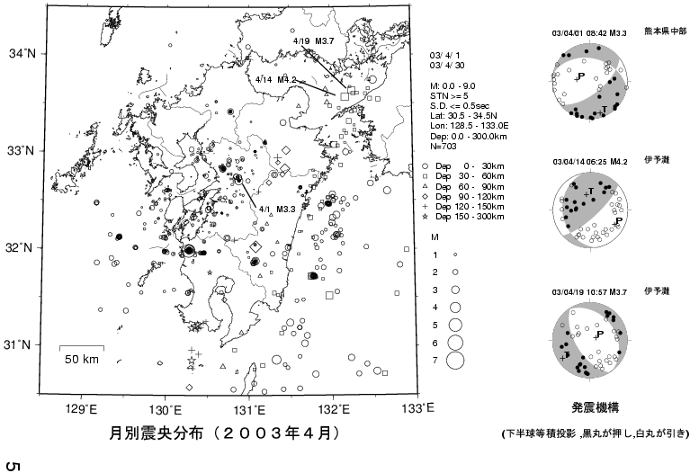 1. 九州の震源分布(2003年2月〜2003年4月)