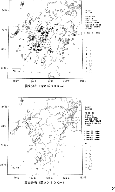1. 九州の震源分布(2004年2月〜2004年4月)
