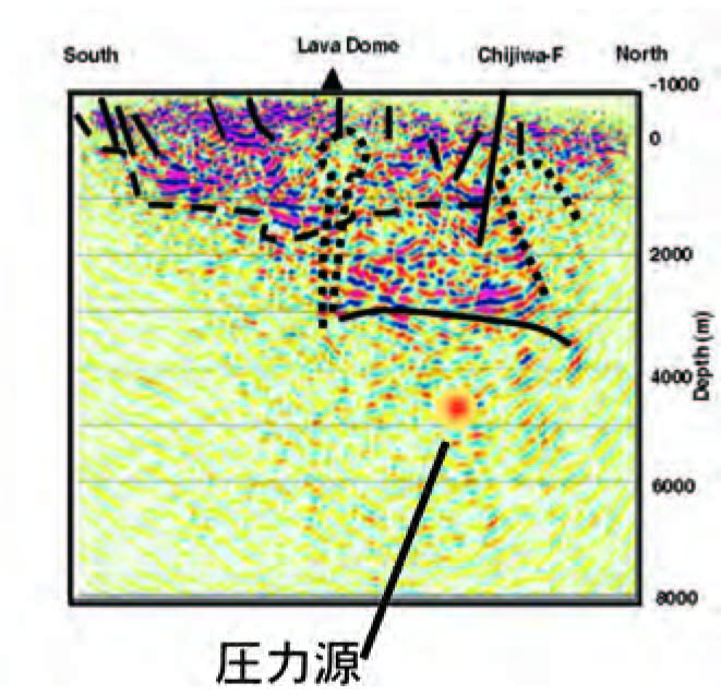 今までに地震活動の様式や速度構造トモグラフィ、反射体イメージング、地殻変動観測による圧力源位置推定の研究が行われてきました。その結果、